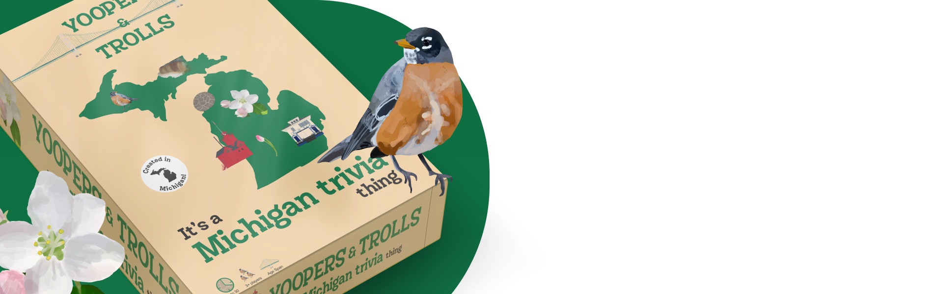 Grab your Faygo, settle in with a pasty, and prove you know Michigan best with Yoopers & Trolls—the board game that’s as Michigan as Mackinac fudge! For the price of a pop and an 8-square Detroit-Style pizza, you too can own a copy of Yoopers & Trolls!